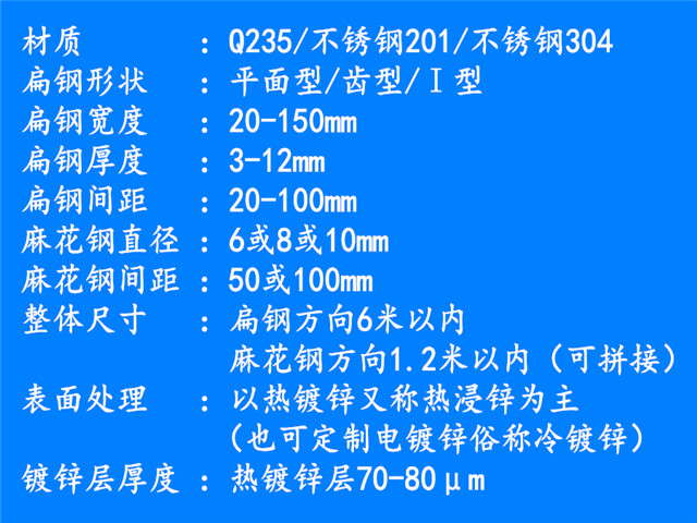 出产平台钢格栅板所运用的扁钢,扁钢是有下差的,通常所选用的的扁钢,其实他的下差是契合国家规范的,所以在扁钢上就会有一些的分量距离。